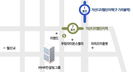 지하철 1,7호선 가산디지털단지역 7번 출구로 나오셔서 150m 직진 후 우측 횡단보도 건너고 좌측 횡단보도 건너서 우측으로 30m 직진 |
